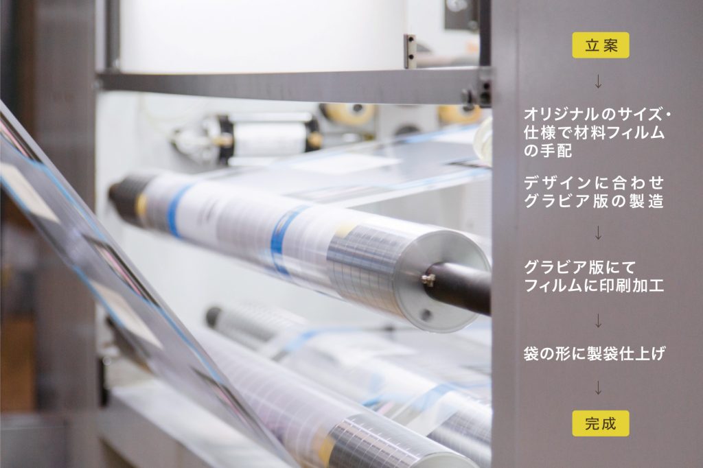 フィルムとグラビア版がそろったら、いよいよ印刷と製袋加工へ、印刷されたフィルムを指定サイズに加工し、検査・梱包を経て出荷されます。この最終工程は10~14日間ほど(ご発注数量や繁忙期などにより変動します)(ハンドル付けや紐遠しなどの作業が必要な仕様の場合はさらに日数が掛かります。)こうして、オリジナルのポリエチレンショッパーが完成します。